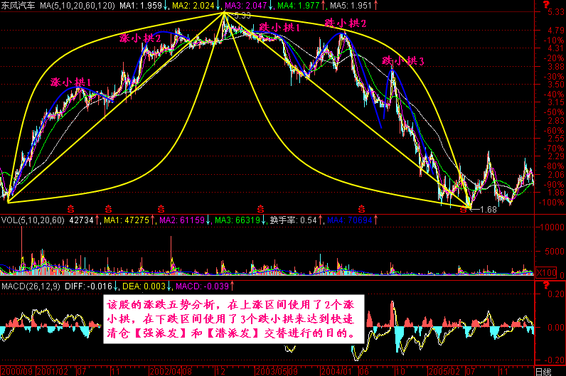 小结:【涨跌五势】把股价涨和跌的所有可能行进线路都包括进去了,通过涨跌五势的不同线路组合,可以模拟出所有股价的运行线路,这就好像是一幅股市活地图一样,为我们指明现在股价所运行的位置和运作模式,从而为我们的股市投资活动提供股票形态学上的依据。