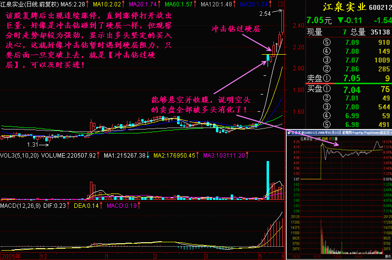 股价在连续的暴涨后也会遇到压力,这个时候往往放出巨量,有时候还是阴巨量,这就像冲击钻遇到硬层一样,这个时候要观察分时走势,如果走势基本强劲的,说明主力并没有出货,其实你从侧面想想也知道,突然涨那么高,散户看到放出巨量,一定怕得要命,早就在震荡中出逃了,主力是不可能在当日出逃的,没人有这个胆量来这么高的地方接盘,所以只能是散户在出逃,而主力在吸纳护盘,主力要出货只有华山一条路——涨!而一旦股价横盘完毕向上突破瞬间,就是【冲击钻过硬层】,股价还有惯性上升,投资者可抓紧机会买入!
