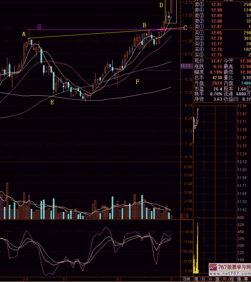 (1)E点是60日平均线与120日平均线的黄金交叉点,以后是暖气带F。在暖气带上方,找到两个股价高点,作连线C。然后,在B点作水平线G。G与C形成“筷子线”,“筷子线”以下是庄家建仓区间,“筷子线”以上是股价加速区间。