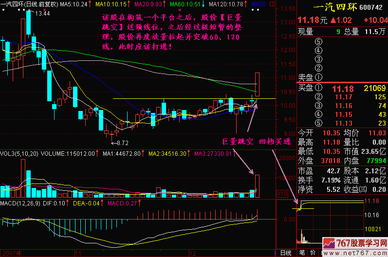【巨量跳空,回档买进】听起来很简单,好像谁都能完成,其实不是那么简单的,它要求你有足够扎实的各项单一技术功底,要能在短时间内判断出该股一段时间来的情况,是否具备连续上涨的条件等等……,这个技术是要多模拟总结才能练好的。