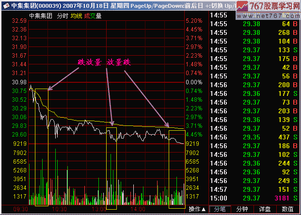 今天大盘选择向下突破,我们发现了一个现象就是指数放量下跌,而那时成交量仅27亿,静悄悄的,现在已经36亿,明显放量。没跌的时候不放量,现在一跌,量就放出来了。见(图177-1)所示。