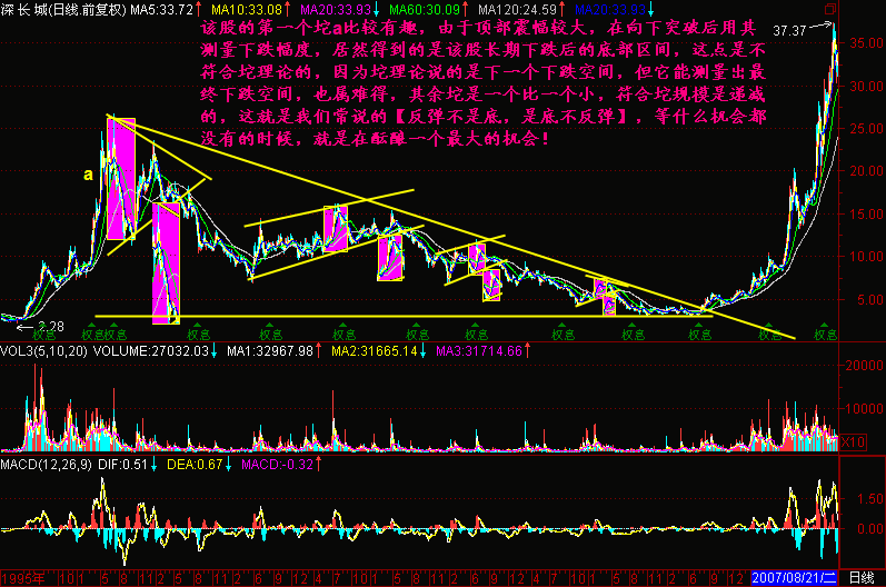 对于顶部震幅较大的股票,似乎可以通过顶部巨大的坨,直接测量出未来股价的底部区间,这个论点以后有待继续求证。