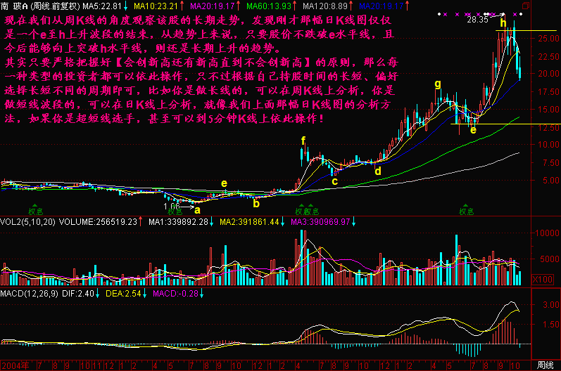 还有一个技术特点,就是【能创新高】。再看图中几个高点d、e、f,我们可以明显看到f点比e点高,e点又比d点高,那么我们就可以这么说,一个会创新高的股价,还会创新高,如果继续放量的话,可能还会创新高,直到有一天它不能创新高。简练地说,就是【会创新高还有新高,直到不创新高】。股价不能创新高了,我们就怀疑它可能要做头。