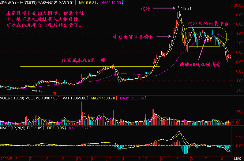 3:过冲式出货,庄家把股价拉高到大大高于目标价位的地方,然后一直向下出货,等跌到自己最初的目标价位时会因为短线超跌的关系,吸引到部分投资者来抢反弹,庄家则乘机逐步清仓,在原定目标价位出不掉的货,通过过冲拉高可顺利出清!