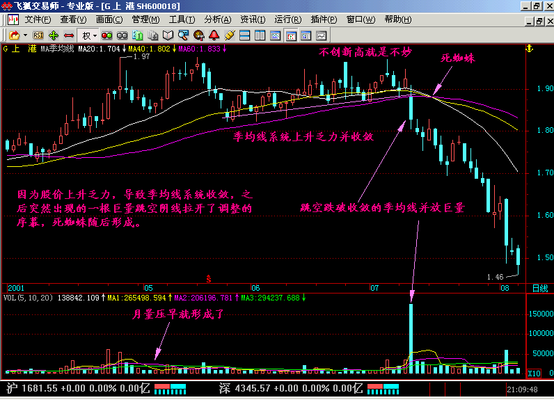 下面是季均线系统上形成的死蜘蛛,在死蜘蛛形成之前股价还运行在季均线系统之上,季均线系统多头排列,但死蜘蛛形成之后均线马上变成空头排列,且股价跌到了死蜘蛛之下,多空分界相当的清晰!见(图17-2)