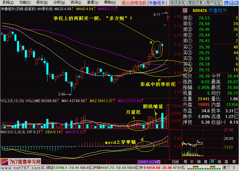 因为一只股票必须有人参与才有行情,而参与的人的多少和参与的程度,一个是看成交量,另一个是看股价是否能在量的配合下站稳在季均线系统之上,只有该买入的人都买好了,股价在季均线系统之上摆好了,那么这个时候如果能推出一组两阳夹一阴K线组合的话,那才是名副其实的“多方炮”!
