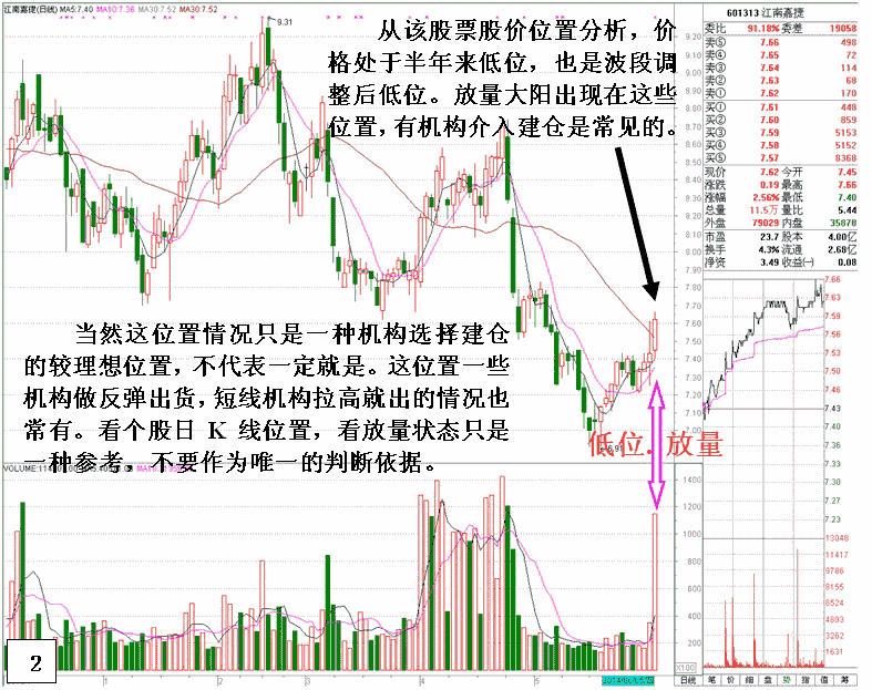 个股低位出现大阳线加成交量明显放大,是分析判断有机构入场建仓的一种重要手段。交易盘口出现大量大买单往上吃货动作,也是分析判断大机构建仓的一种方法。这两种传统看盘分析方法是技术派分析研判的基础。而同样的方法每一个使用者分析得出的结论,操作的结果有着很大的差别。