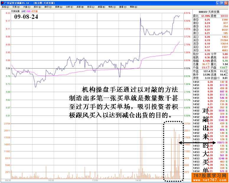 机构操盘手操盘手刻意做出如此盘口目的是:卖盘挂着大卖单说明股价上升有压力,但买盘下挂出的大买单数量更大更能显示出更强的支撑。在巨大买卖单夹盘股价上下两难时,操盘手利用对敲操作方式造出大量买单往往卖盘大卖单啃去则能制造出又强又大的买盘在抢进该股。这样的操作动作连贯展开可以引诱部分不明真相的投资者跟风买入。另外在此环境下有时部分机构操盘手还通过以对敲的方法制造出多笔一张买单就是数量数千甚至过万手的大买单,这样可以进一步欺骗投资者以为该股有真正的大机构大资金在入场,以此吸引投资者积极跟风买入以达到减仓出货的目的。今日出现在天房发展该股下午14:47分到收盘这段时间的盘口就上演了笔者上面所描述的这一幕!