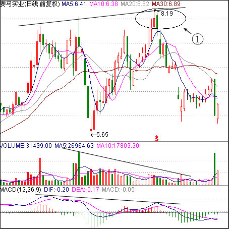 图中①处,该股假突破,而且是“阴包阳穿头破脚”K线组合,卖股!
