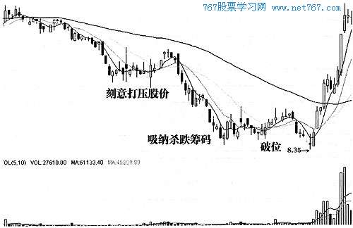 (1)这种形态意义都是在市场极端的空头末期的主力操纵形态,但其间存在着明显的方向性和目的性的差别。前者是主力以长期为目的的推高建仓,而后者是借助市场的恐慌气氛,承接市场的恐慌性抛盘,达到低位廉价扫货的目的。然后利用恐慌性抛盘杀出后而呈现的极其轻的反弹压力与反弹空间,快速制造反弹,待股价突破趋势压力,被市场一片看好时,快速派发手中筹码,其主力的胆识和操盘技巧及对市场时机的利用堪称经典。
